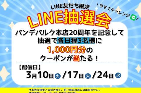 3/10(火)・17(火)・24(火)はLINE抽選会! 1,000円分のクーポンが抽選で当たるかも! 是非お友達登録してね♪